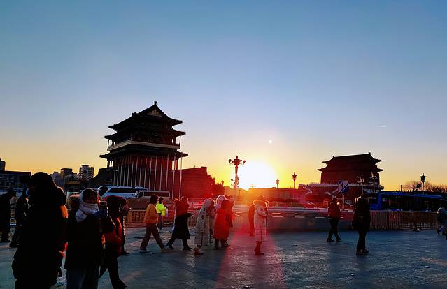 升旗后,日出东方,照耀大地和你我,沐浴于阳光下,暖和