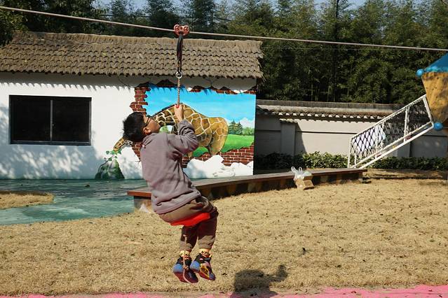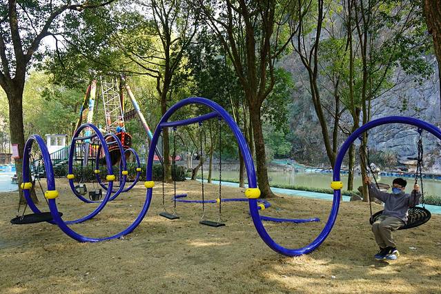 结束丛林飞车,在原地坐魔毯上山,再走一段路就可以去玩高空秋千了,还会经过恐龙谷,小朋友们肯定喜欢和恐龙拍照啦。高空秋千还是挺考验胆量的,用钢索把秋千拉到最高处,放下秋千的那一刻,只听见一声声尖叫。