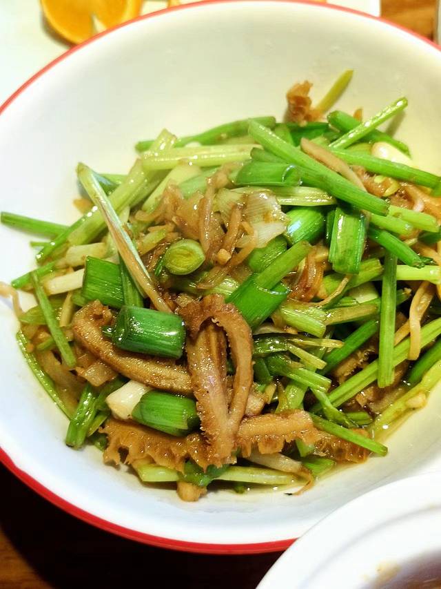 酸萝卜炒牛肚。酸萝卜刚好给这顿荤菜较多的解腻