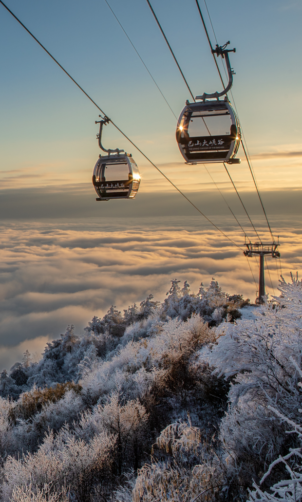 首先,要乘坐罗盘顶索道上山,随着索道越升越高,巴山大峡谷的冬日盛景也逐渐展开在眼前。