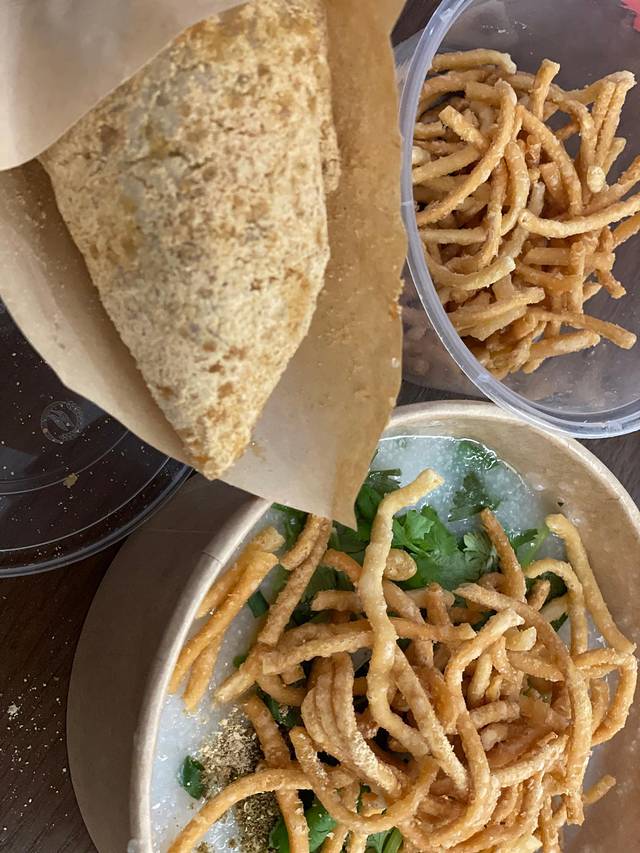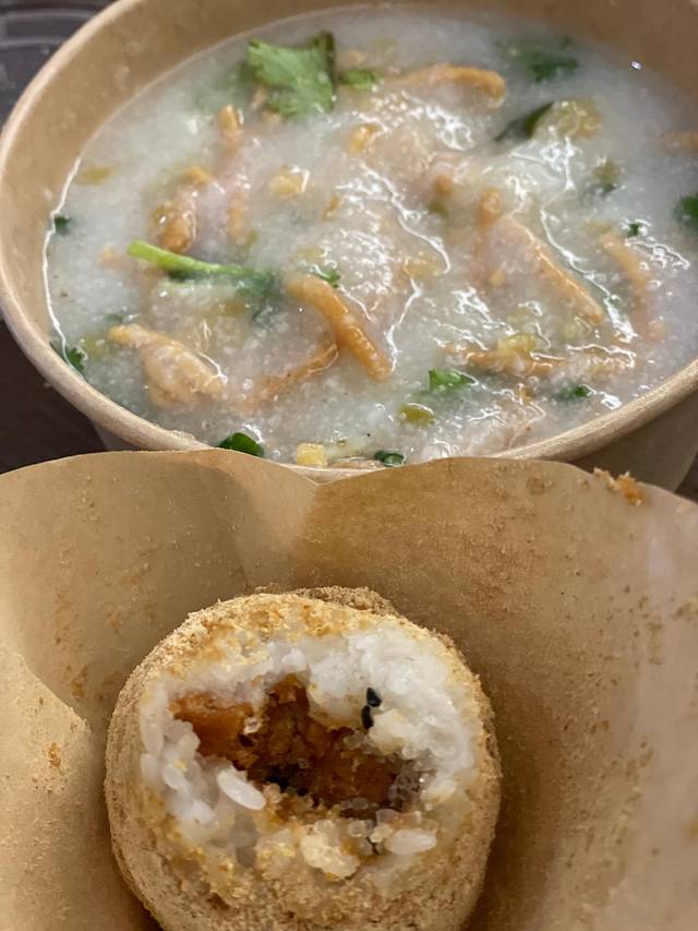 糯米饭团,超扎实一个,我买了甜的,里面是脆脆油条。配一碗油面茶,咸咸的,上面像撒子似的,很奇妙
