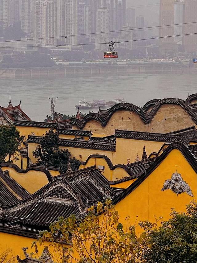 还有一个我特别喜欢的是,坐小电梯上到桥上俯瞰湖广会馆,层层叠叠的黄色真的太好看了!远处还有长江索道,感兴趣的也可以去坐一坐感受。