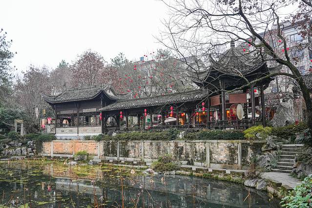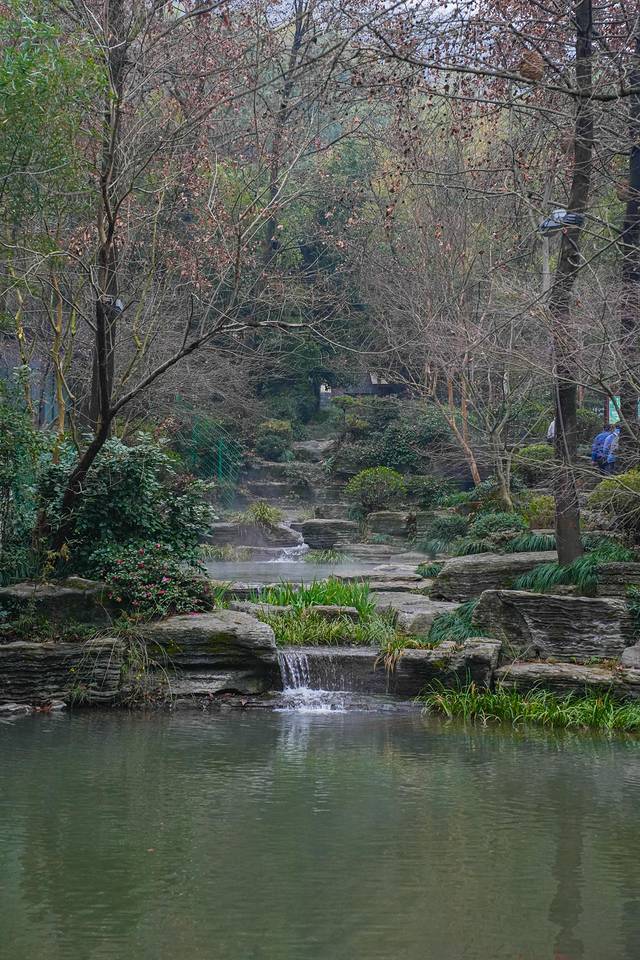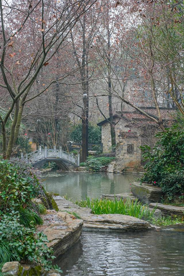 一汪山泉沿着山谷蜿蜒盘旋,终年潺潺不绝,石径小桥,亭台楼阁点缀其中,一派世外桃源,人间仙境。
