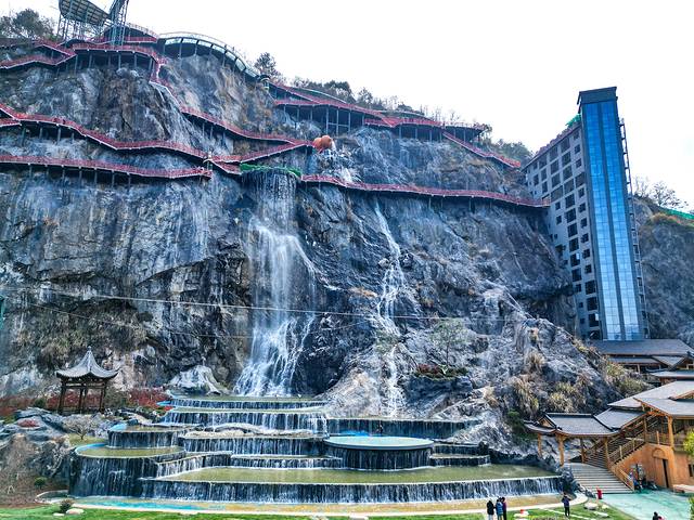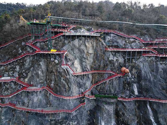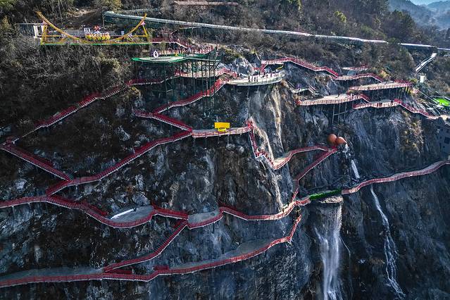 在悬崖旁有一个高17楼的电梯,我们可以乘坐这个电梯登上悬崖,不用爬山就能上到山顶真的是so easy~可乘坐电梯到13楼,这里有一处悬崖咖啡馆,边喝咖啡边休息,或者直接登顶17楼。从电梯出来,就是盘旋在悬崖上的悬崖栈道,从远处看,整个栈道的造型就像一朵巨大的云朵,依山而建蜿蜒向前,行走在栈道上,仿佛踏在云端,御风而行,逍遥自在,快乐似神仙。