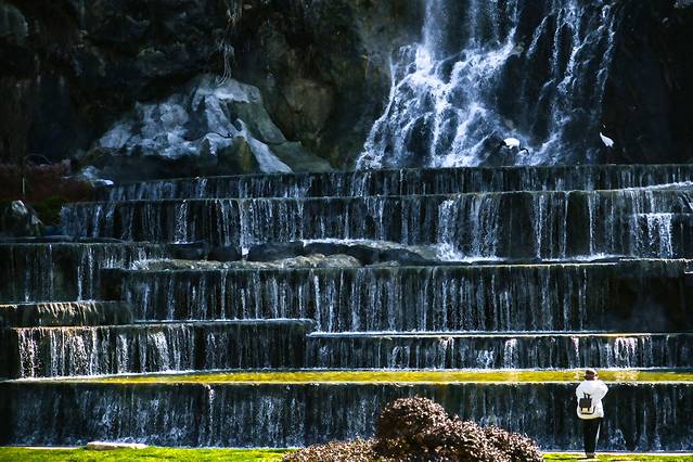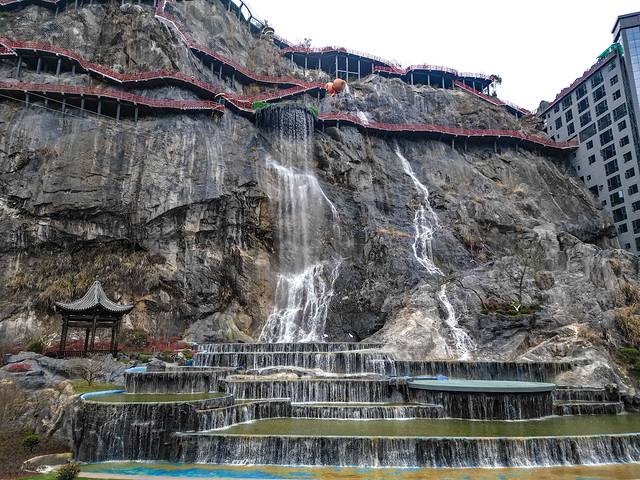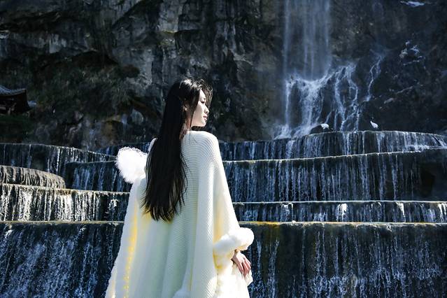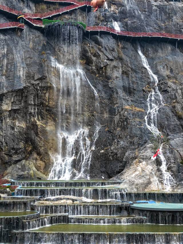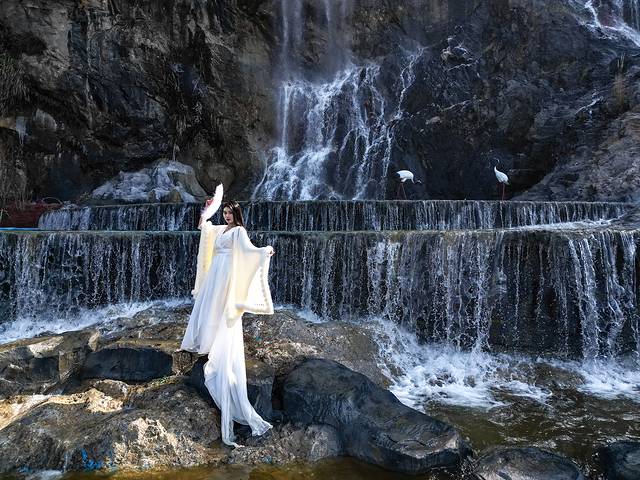 悬崖瀑布真的太太太出片了,眼前是飞瀑直下,水雾弥漫,瀑布下两只仙鹤伫立水边,此时一名红衣仙子闯入,这一切宛如仙境,古风仙侠感满满,这也太梦幻了吧。走进一看,原来红衣仙子是在瀑布前飞仙的小姐姐,景区专门在瀑布前装置了威亚飞仙表演,真的太会玩儿了,游客也可以自己买票体验,景区提供仙气飘飘的汉服,25元一套。此时,我站在瀑布前,任由水雾拂面,那一刻仿佛自己也融入了这如画如仙的景色中,成为了这奇幻世界的一部分。