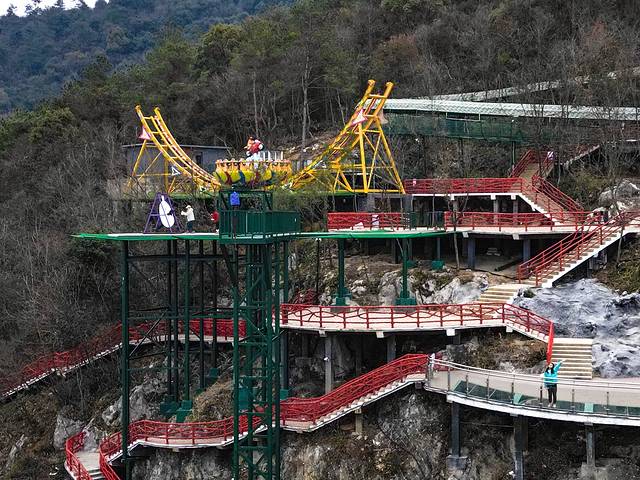 到了山顶,就全都是刺激惊险的体验项目了,玻璃观景台是观赏赤洲岭全景的最佳所在。玻璃观景台旁设置了凌空漂越、微蹦极、天空之境,凌空漂越和微蹦极略带刺激,天空之境绝对是一个出很多美照的地方,而最顶端的丛林飞车,全长1280m,从悬崖最高点出发,全程大约20min,穿梭在半个悬崖之中,肾上腺素飙升,是那种漂移的刺激感,酣畅淋漓。