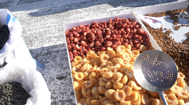 除了海鲜还有各种水果,冻梨冻柿子,草莓和黄桃等等。