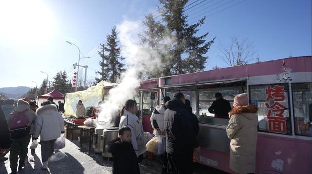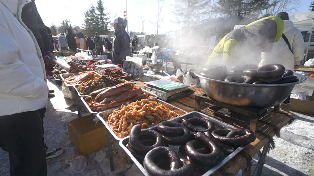 还有卖东北特色和朝鲜族特色食品的摊位。热乎乎的现做现卖,很有烟火气。