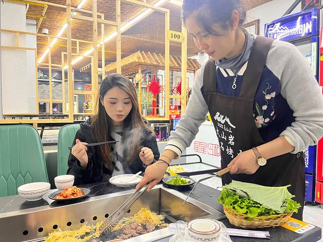 我们这次来的是在抚松县城的火山岩岩石烤肉,开车离万达度假区有20分钟的车程。点了一些比较特色的菜,老板娘还会亲自给我们烤。酸菜和榆黄蘑都很鲜,很有当地特色。牛肉也比较嫩能够咬的动。能吃辣的朋友一定要尝试他们的辣酱,真的很开胃。这一顿一共花费了💰124,很经济实惠,两个人也吃的很饱,回酒店休息啦。