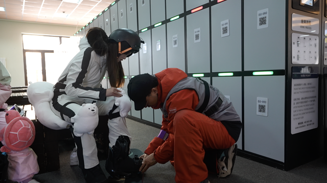 因为之前从没有滑过雪,所以我们直接来到了比较新手一点的万达果松滑雪中心。雪场的雪鞋、学具和头盔都是含在雪票里的,我们自己花钱💰200租了好看的雪服和雪具。这里的工作人员非常的贴心,在为你提供各种服务的同时还提供教学,真的是亲自为我演示了雪鞋和雪板的穿着方式。给我减少了很多不必要的麻烦。