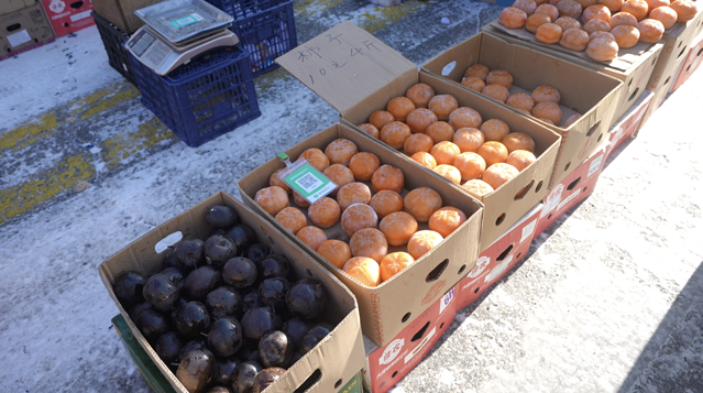 因为室外温度低,海鲜直接摆在地上卖。室外简直就是一个天然的大冰箱。