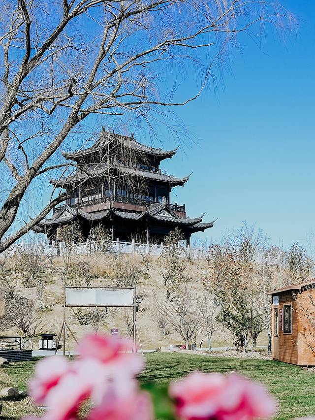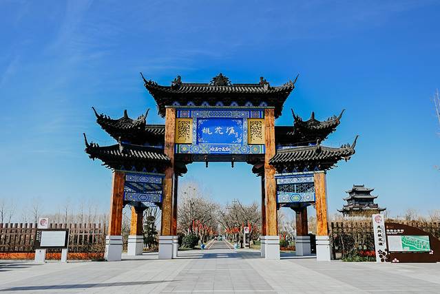 进门第一眼就可以看到景区的地标--巍峨耸立的桃花阁和寿星公。桃花阁巍峨耸立在景区内,在景区任何地方都能看到,也是打卡拍照的最佳机位,登高可以远眺整个景区。与前方的草地、湖面、木栈道、寿星公融为一体,构成一道美丽的画面。