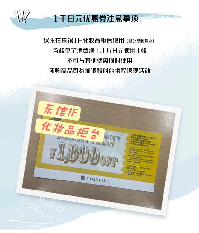 优惠券在大丸东馆1F的化妆品柜台使用,有没有护照都无所谓,一笔消费用一张(单笔金额税后1.1万日元),大丸百货现有所有优惠只能任选其一,游客在办理免税手续时可以参加携程返现的活动,相当于折上折。