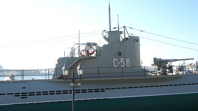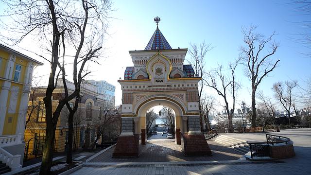 打车来到了海参崴的凯旋门。凯旋门是海参崴城市的标志之一。它是亚历山大三世为自己的父皇尼古拉·亚历山德罗维奇所建设的,纪念开疆扩土的丰功伟绩。创建于1891年,拱门不远处就是黄金角湾,结合了欧洲凯旋门特点和俄罗斯建筑风格。旁边就是为俄罗斯士兵而建的东正教堂。在这里打卡拍照后,就去到了C-56潜艇。
