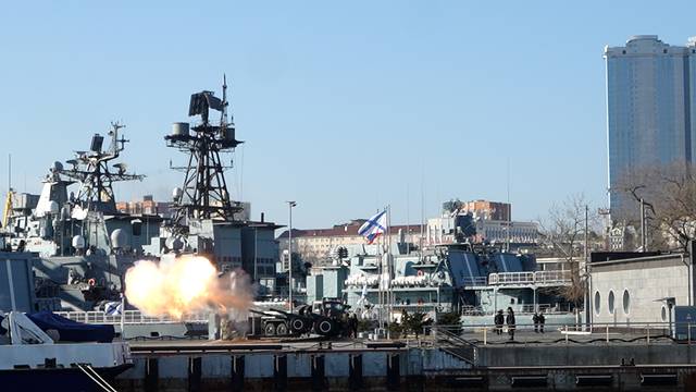参观过潜艇,我们走到了马路的对面。没有等多一会儿,太平洋舰队的官兵开始了他们每日必备的鸣炮仪式。炮声随着教堂12点的钟声一同响起,一定要提前做好心理准备,炮声真的非常震耳欲聋。