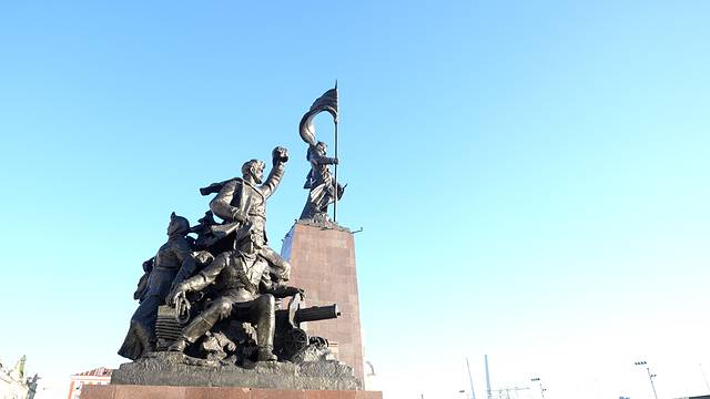 广场正中的纪念碑始建于1961年,据说是俄罗斯远东地区最大的一座纪念碑,锗红色的大理石基座上雕塑了一位年轻的苏联红军战士,右手擎着一面高高飘扬的苏维埃旗帜,左手握着军号的立姿铜像,和碑两侧另两座群雕一起,分别表现了红军战士、工人、农民与白匪浴血战斗的情景。这组纪念碑表现的是1917年十月革命成功后,苏联红军部队历时五年的艰辛征战,于1922年到达海参崴的情景。
