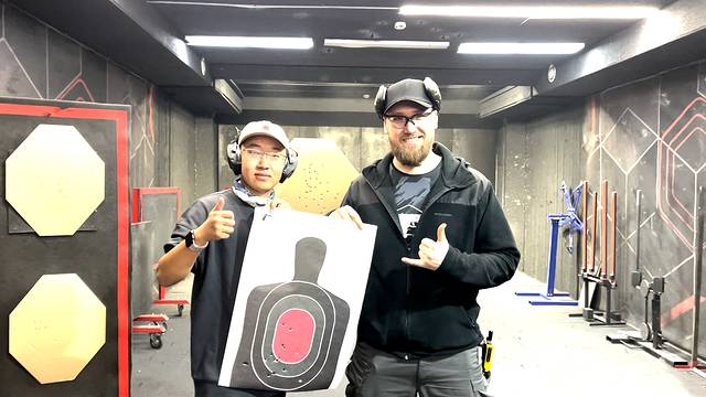 不得不说这个标准口径的射击超级爽,尤其是击发的一刹那。枪械的后坐力也很大。抵在肩上很有冲击感。教练还会根据你的操作进行相应的指导。体验结束,我们还把靶纸带走,打算带回国贴在家里。