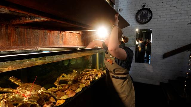 到达餐厅,坐电梯上到二楼。这里的环境也非常可以,十分适合两个人约会。门口的缸里养着鲜活的帝王蟹和扇贝、生蚝之类的海鲜。看来是顾客想吃哪个就直接现捞。
