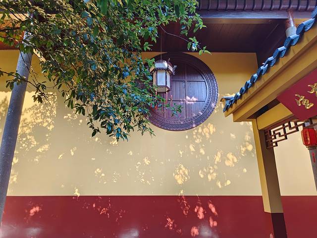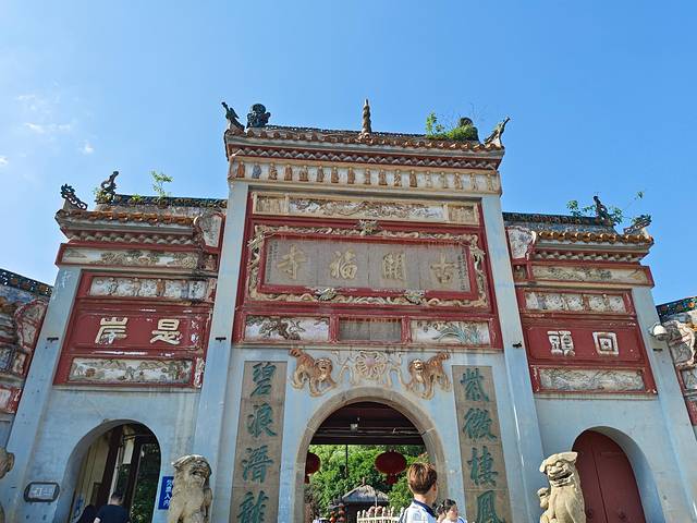 山门:山门为四柱三门三楼花岗石牌坊式建筑,高10米。门坊上分栏为浮雕彩绘,或为人物,或为树木花草。山门两旁立有石狮、石象各一对