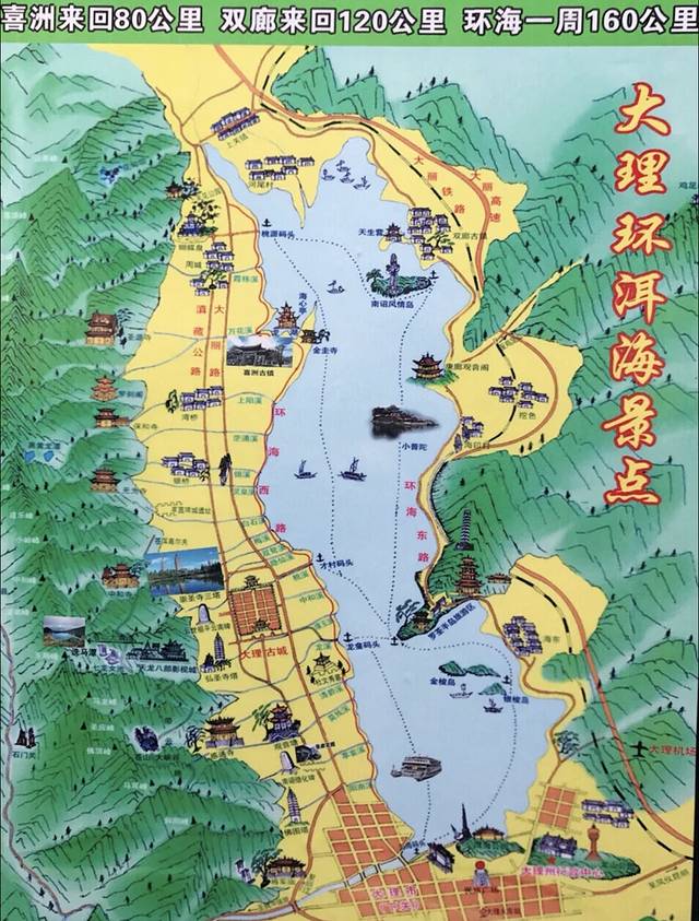 租电动车去(50/2人)电动车环洱海,喜洲镇吃喜洲粑粑,看白族扎染,逛古庙。双廊镇,必吃美食烤乳扇,椰子。返回。(图洱海环行地图)