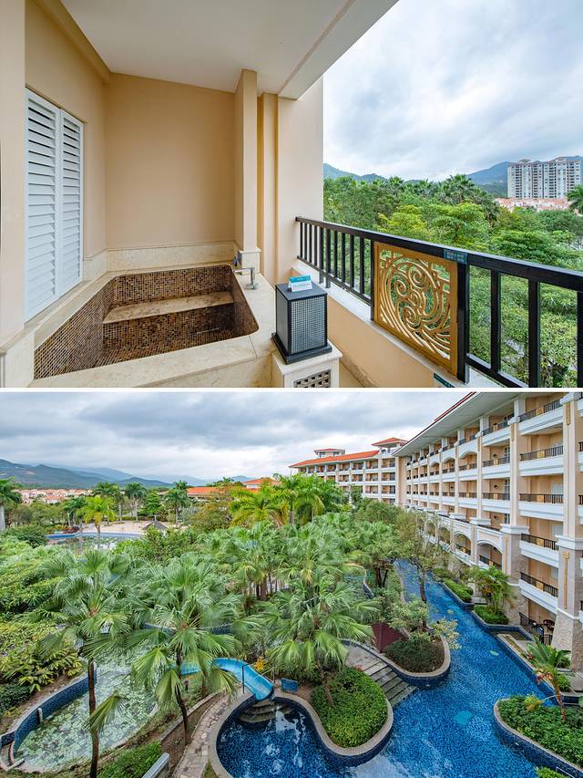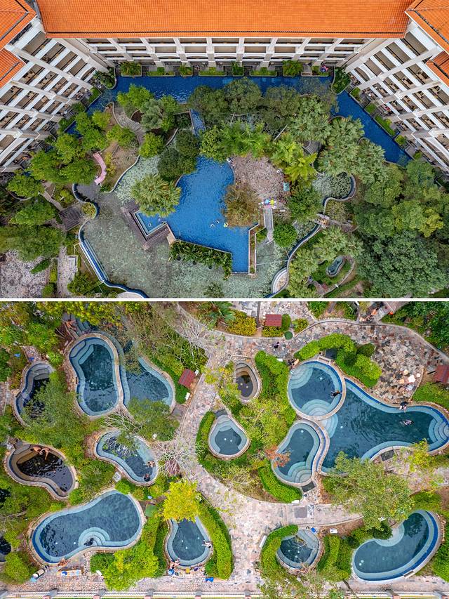 我入住的水景房面积达45平,设备设施齐全,格调温馨典雅,阳台还设有私密温泉泡池,楼下是池畔亲水客房,从露台下去就是温泉泳道,在此可畅泳可划船,即使是寒冬也能体验玩水的乐趣。当然,在此拍照也很出片,是酒店热门的网红打卡点。