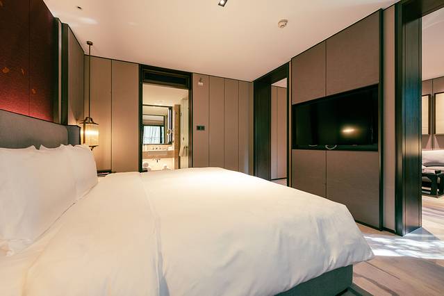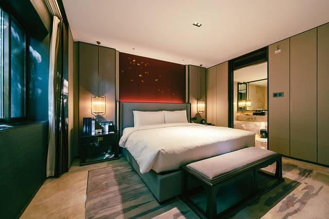 酒店以古朴的色调、典雅的气质展现了盛唐时期中国建筑的大气与恢弘。古典风格的曲廊,使园林和建筑自然过渡。一边是茂密的藤蔓植物在一孔一孔花窗前垂下枝条,随着四季变迁,春华秋荣,又随着阴晴雨雪,洒下光影之舞。另一边则是人居建筑,每一扇门打开就将安放疲惫的身躯,让都市与旅行的喧嚣在静室之内沉寂再沉寂。疏影横斜水清浅,月窗一角不经意间现出一片曲池风光。曲池不大,但容纳天光云影,游鱼禽鸟畅游水中。