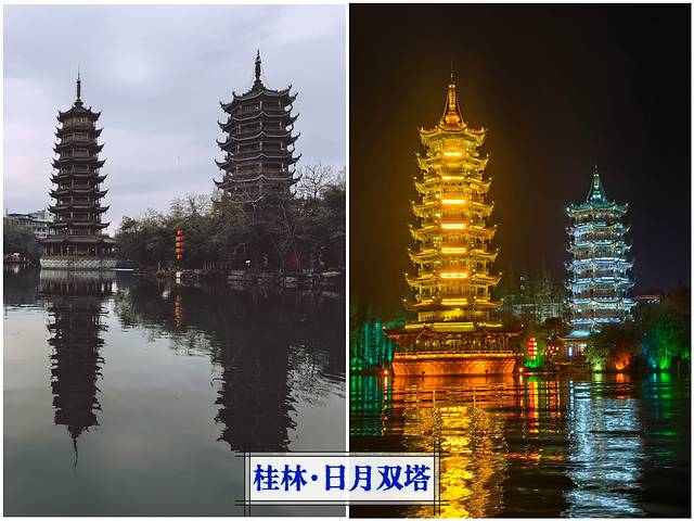 桂林被两江(漓江、桃花江)、四湖(木龙湖、榕湖、桂湖、杉湖)包围着,象山、伏波山、叠彩山、独秀峰等形态各异的小山峰,点缀在楼群街道周围,与这座城市融为一体,简直就是一副人与自然的山水巨作。