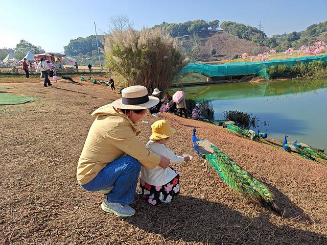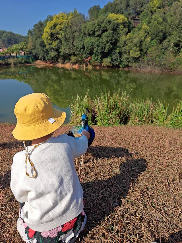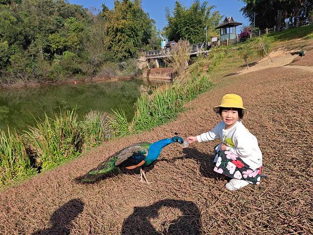 喂到了孔雀。孔雀是一种很高傲的动物,你如果追着她,她反而不会理你。你要蹲下来等着她主动靠近,你才能接近她。