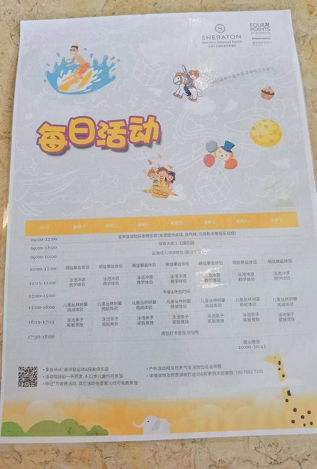 酒店里有孩子的攀岩和冲浪活动,都参加了,接触下新事物,孩子们都喜欢。