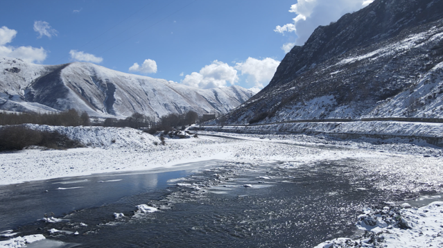 落雪过后的新都桥被一片白色覆盖。因为地处乡镇,清雪的响应速度没有城市里那么快。