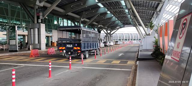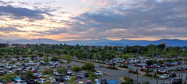 早晨的亚庇机场很安静。门口的停车场满满当当。远处的朝霞投射出云层。
