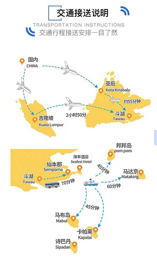 沙巴的首府叫哥打京那巴鲁,简单称呼叫亚庇,仙本那是沙巴的一个小乡镇,著名的旅游景点,在沙巴州的东南角。国内到沙巴的大交通,大体两条线,直飞亚庇或者直飞吉隆坡再转亚庇。如果假期充足的准备东-西马穿梭,可以考虑直飞吉隆坡线,否则10天以下的假期还是推荐直飞亚庇。到了亚庇,可以选择城市游,或者直接不停脚转机飞到斗湖,再通过接驳巴士,1个小时就到仙本那镇上了,听起来比较折腾,跑了一圈感觉也还好,红眼航班也没那么难受。