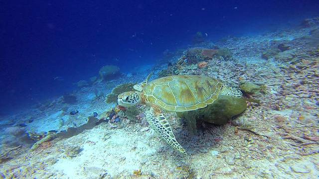 "叮叮叮叮“这是潜水最喜欢听的声音,Tom的叮叮棒,第一个小惊喜就是一条大大的拿破仑,再然后就是自由自在的海龟。整条线路就是顺着洋流围绕着马达京本岛的边缘探索。”叮叮叮“,先看Tom手势,是一条魔鬼鱼,然后就是原地团团转的寻找,就看到隐约中一条远去的黑影。海龟真是很多。出水之前还是巨大的礁石下的缝隙里,发现一只正在睡觉的海龟,真挺聪明的,把自己卡在下面,安全又省力。