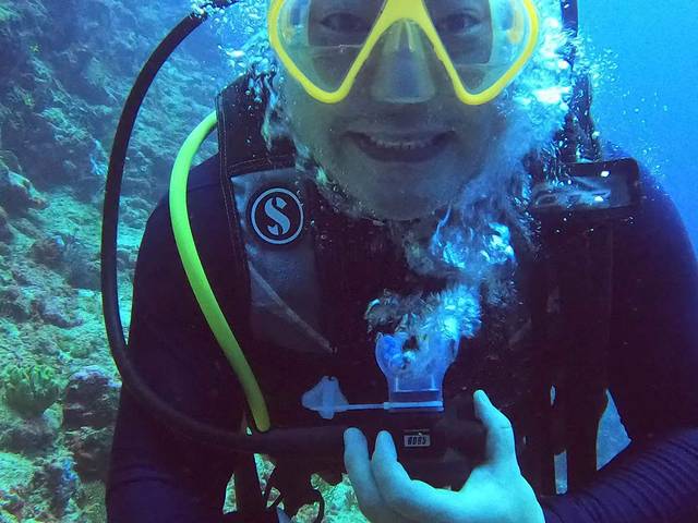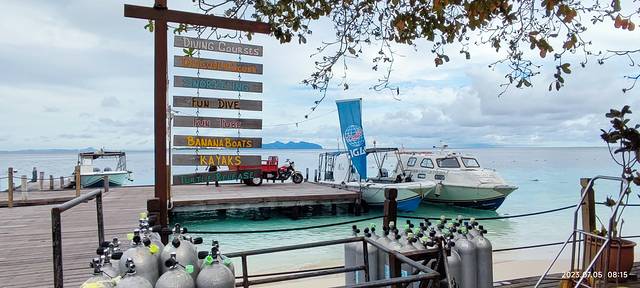 下午雨是彻底停了,他们还在睡觉。我赶在3点就来到潜店。潜导Tom人很热情,对我带来的脚蹼很感兴趣,试了又试,觉得质量不错。同行的还有两位女士,他们的行程是为了明天去诗巴丹。都交代清楚了注意事项,试穿了装备。
