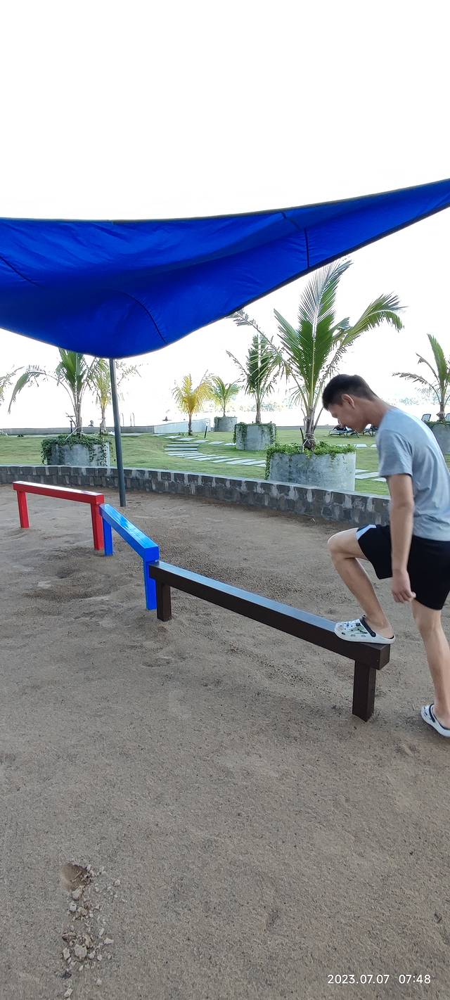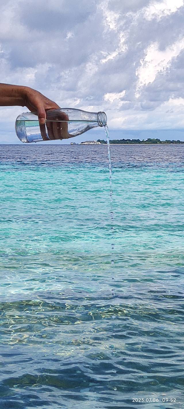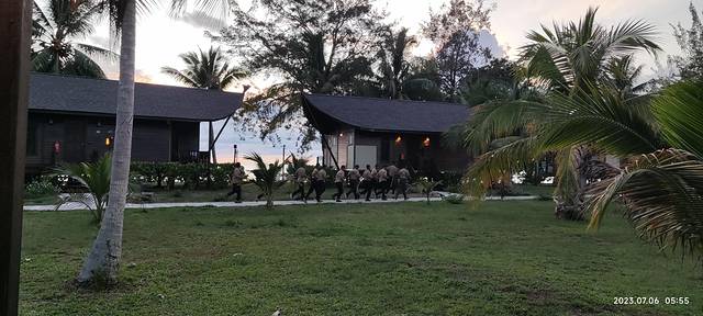 马达京的最后一天,5点起床遇见守岛的军人已经在晨练了。房间门口的草地上,拍下了日月同辉的照片。此刻的拖尾沙滩是这样的,已经能看见海水没过了浮潜区域的边界绳索,其实此刻已经是在涨潮状态,这也是我们之后遇险的原因。也许是最后一天的激动,大家起得都很早,趁着太阳出来了,决定珍惜岛上的时间,下水再去看看。