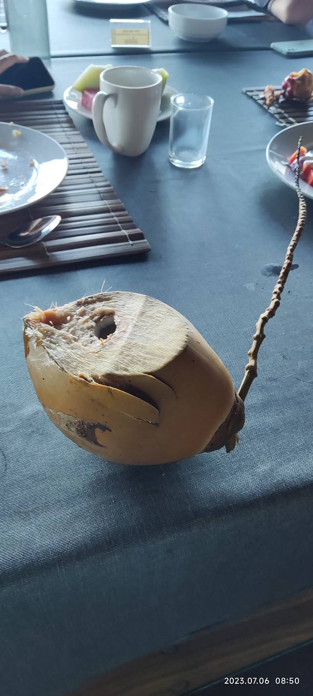 女士们说来这都没尝过椰子味,嘿,你们都给我等着,出餐厅,门口就是椰子树,请求整理花木的服务员手下留情,打下的椰子不要扔,帮忙砍两刀,这不妥妥鲜椰汁有了,各位团友喜出望外,吃饱喝足,到俱乐部报道,气瓶已经上船,彩旗飘飘,真是充满能量的一天。