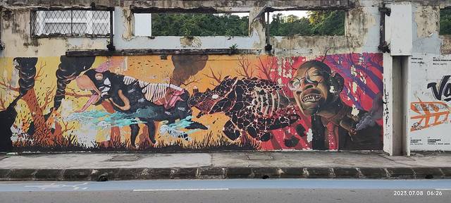 哲思顿码头周边的环境已经变的熟悉起来,清晨的空气被炸裂的摩托车轰鸣搅动着。阳关照射的地方,明显能感到暴虐的炙烤。街头的涂鸦也仿佛能体现热带海岛的特色,这些画与国内的“遮丑”墙功能一样,但这感官是不是差了太多?