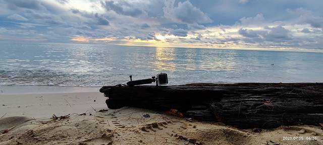 早上起来最要紧的就是关心天气,忙着奔赴海边瞧瞧海况,还不错,兑付着能欣赏到了朝阳。晃悠到拖尾沙滩边的栈桥,就想着看看远处的小马达京岛,没想到眼皮子底下的海水里一团黑影越越来越近。心中确实也有些期待,有些怀疑,真到看见一只大海龟在浅水遛弯时,不敢相信的激动,心跳加速,左右环顾,就想招呼人快来看海龟,我的天,原来海龟能长这么大,直径得有1.5M以上。无奈就我一个起这么早,没法分享这份激动,不忍打破这宁静的画面,两个中年物种的偶遇,激动到了嘴边又吞了回去,只能跟着它、目送它慢慢游向外海。后来发现连续两天早上它都会来栈桥转转,这里提醒要上岛得小伙伴早上6点半左右,概率很大哦。