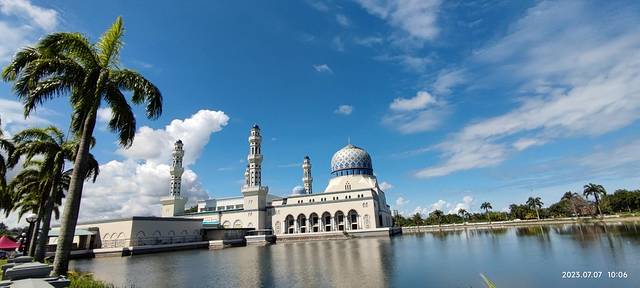 今天我们的目标是水上清真寺和沙巴大学。导航一直向北行驶,沿途是一条海滨大道,绝美!这亚庇市区的驾驶环境属实有点难度,车辆车速基本都在70,炸街党的摩托车就这样还嗖嗖嗖的从身边略过。水上清真寺,在外围打了个卡,因为一片水池,蓝天白云倒映出来的清真寺显得气势辉宏。