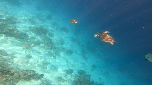 早上的海水是如此的温暖舒适,本来还担心会不会有点凉。栈桥处的海龟还是如约而至,一靠近就立刻逃走。南岸浮潜区域早上是拿破仑鱼群统治的区域,成群结队,也有几只落单的海狼。女士们跟的不近,突如其来的海龟,激动还未释放转眼就消失了。早上的水母也特别多,随处可见飘动的触须,皮肤也能感觉到轻微的刺痛,但是此刻的肾上腺素已经蹭蹭激增了,没有感觉,完全没有感觉。
