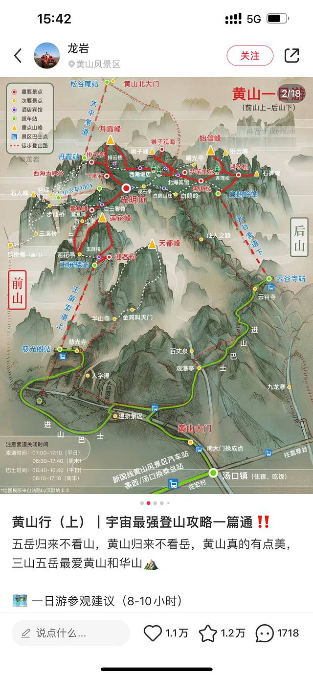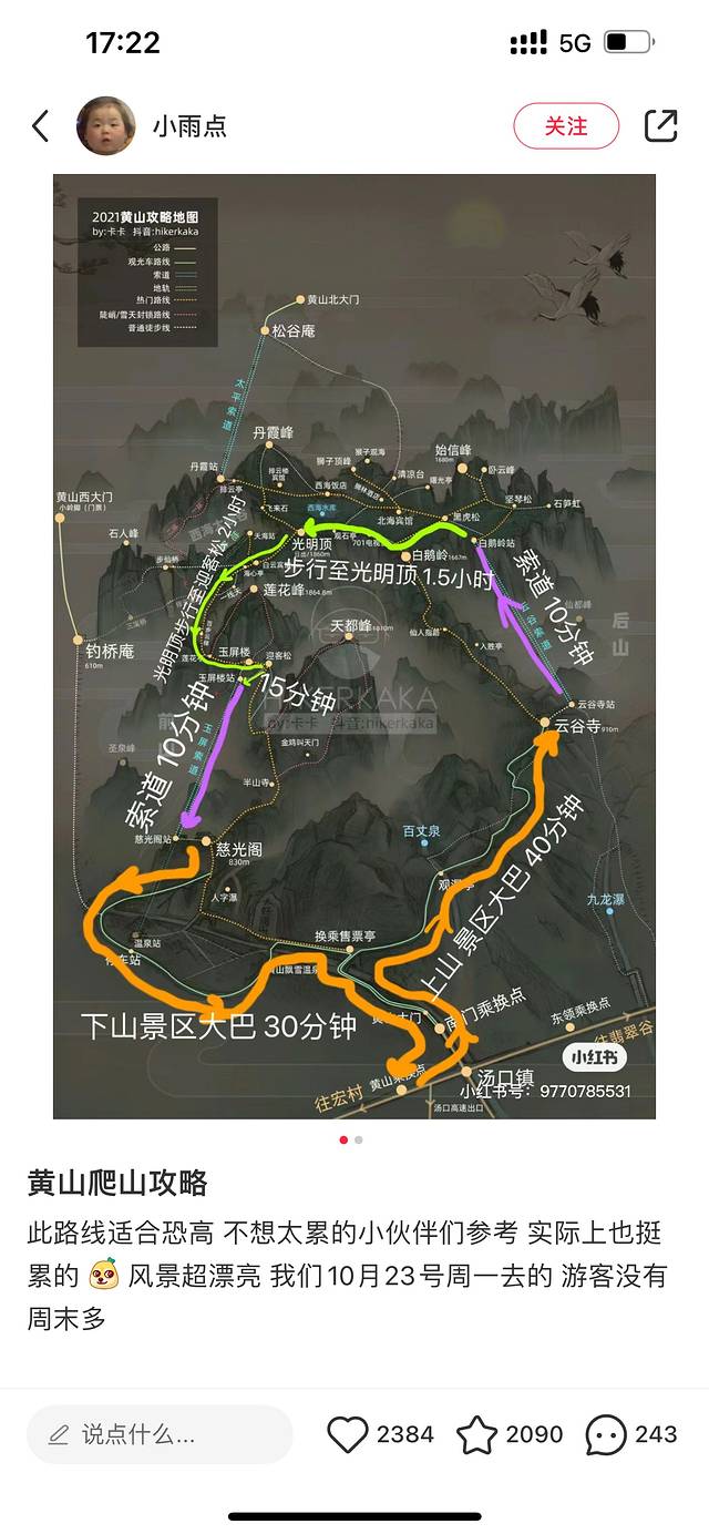 虽然没去,也总结了好多经验,到了黄山南大门1.买新国线的票,2.买缆车的票,上了玉屏索道缆车从迎客松开始看起,也得爬个四十分钟,体力不支的可以返程玉屏索道下来了。3.觉得自己像我一样鼓起来几年的勇气,不想过夜的,体力可以又不可以的:迎客松-光明顶-北海宾馆-黑狐宋-始信峰-云谷索道。4.体力杠杠的:可以不索道,纯爬;可以晚上在山上过夜,第二天起来看日出继续爬(山上过夜三四百起,上下铺的床位,标间过千,也在公众号上预定