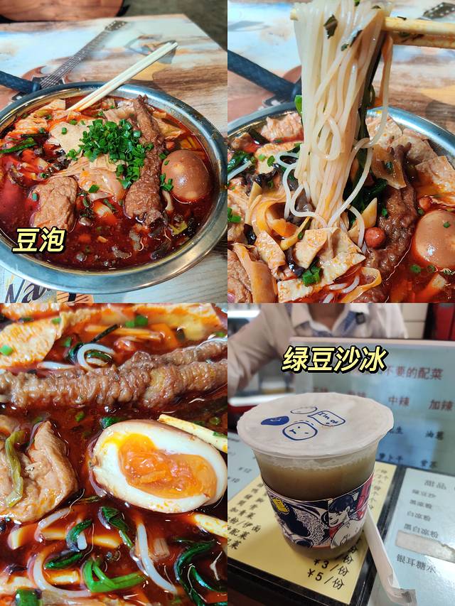 值得强调的是!柳州的螺蛳粉真的和其他城市卖的是很不一样的味道,柳州的螺蛳粉不臭!新月螺蛳粉他们家料很多很丰富,木耳很爽脆,大片的腐竹吃起来非常满足,我加了豆泡、鸭爪,正好赶上周二,可以免费赠送溏心蛋或鸭爪,就再加上一个招牌溏心蛋。他们家的豆泡挺结实的,粉个人感觉稍微生一点,整体来说是挺好吃的。店里有售卖绿豆沙冰和凉粉,辣得不行的时候可以解解辣。