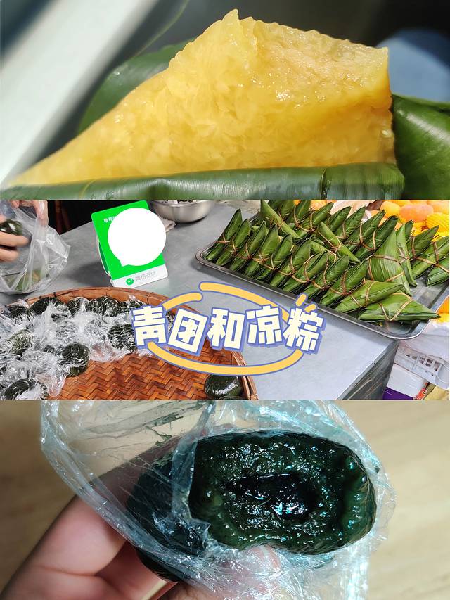 青团和凉粽是在一个老爷爷那买的,青团里的馅能吃到糖砂,皮和馅的艾草味挺重的,是手工制品才有的味道。凉粽是三角形的,用来蘸着吃的糖需要另外买,一袋好像是1、2块钱
