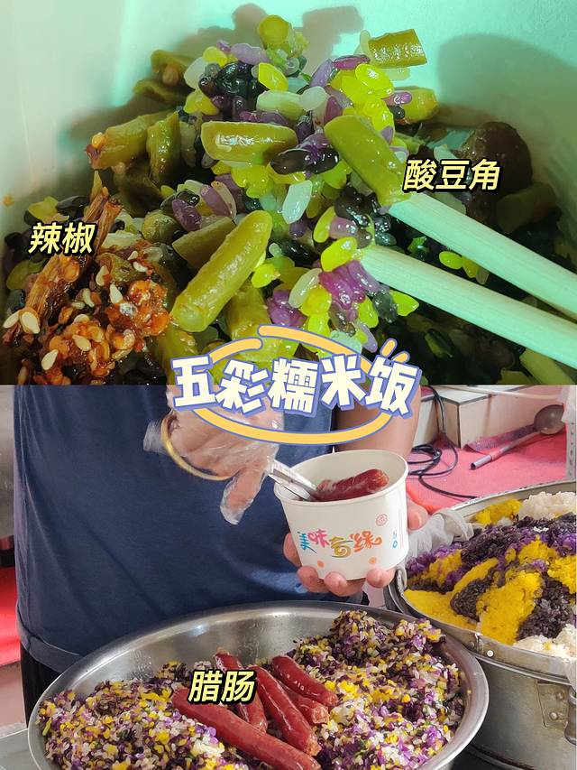五彩糯米饭💰6r 五颜六色看起来很有食欲,可以加肠也可以不加,最上面撒上酸豆角,可以加辣椒。糯米粉很有嚼劲,不会糊成一团,也不会特别粒粒分明,肠一点也不油腻,偏甜口。