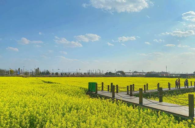 沿着铁轨漫步,一片片油菜花随风摇曳,一幅迷人的春日画卷映入眼帘,简直不要太美啦!