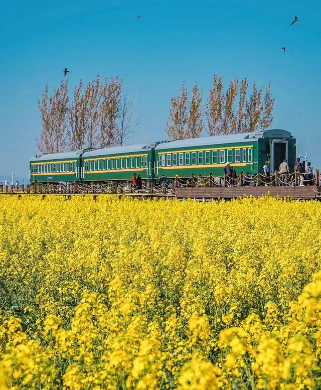 现在油菜花开得很好,在蓝天白云的映衬下,绿皮小火车穿梭在花田之间,超有童话感