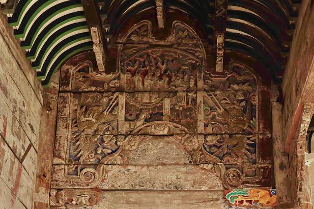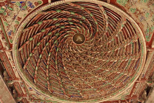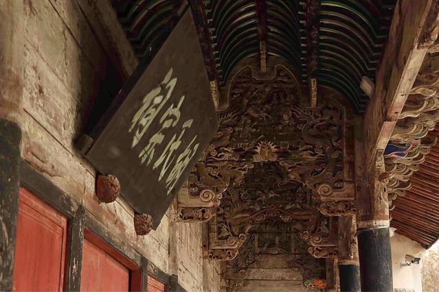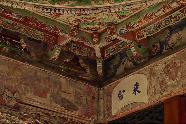 再往前走,戏台藻井开始以压迫式的中华建组美学呈现眼前,藻井呈圆形,螺旋式叠涩右旋盘筑,井口以16个龙头状坐斗向上重叠,出华拱15跳,每个华供右侧斜挑如意小龙形拱,龙尾归结于顶部明镜,攒与攒之间有彩绘透雕连拱板相连,平棊上绘有蝙蝠、花草纹彩画。