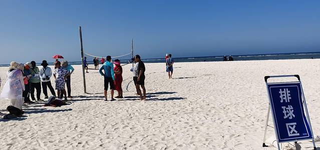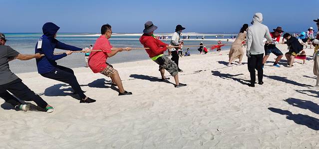 在沙滩上组织了拔河比赛,三局二胜,好不热闹。赛后他们获得了小奖品