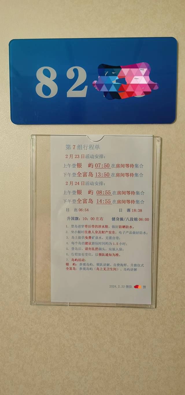领队提前把分组情况和铺位号发过来了,进入大厅,找到自己的组别,领队提前在那里守候,给办好手续,每人发一个胸牌,这个要随身携带,船上的几天都要用到。