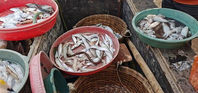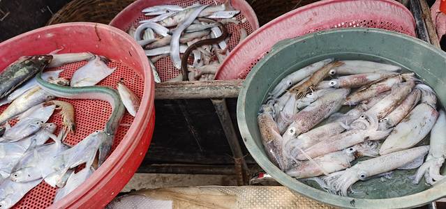 有渔民骑着三轮车来卖从海里打捞上不久的鲜鱼,村民们围着买。真羡慕他们能吃到新鲜的海产品,可惜带不回来